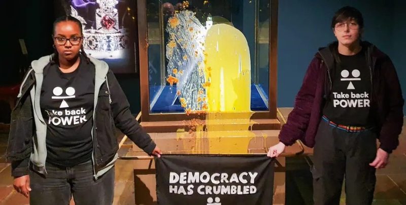 Четверо активістів закидали яблучним пирогом вітрину в Лондонському Тауері, де зберігається корона Британської імперії. Після цього вони облили скляну поверхню яскраво-жовтим заварним кремом. Таким чином учасники акції вимагали створити новий виборний орган — так звану “Палату народу” — та запровадити податки для надмірно багатих громадян. Про інцидент повідомляє The Guardian.